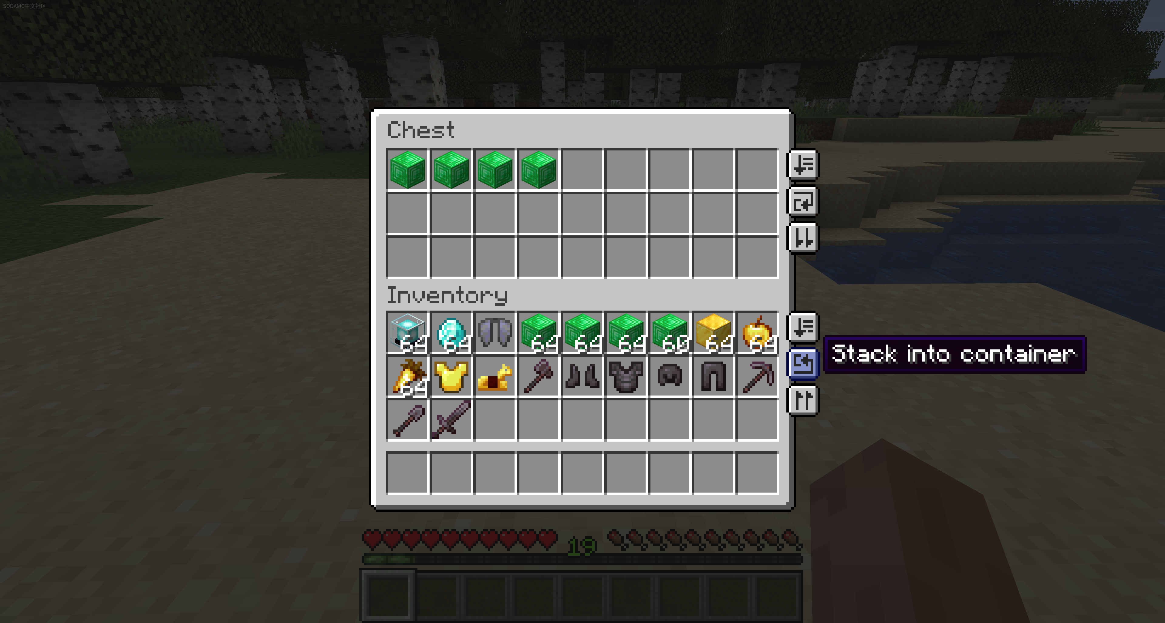 通过点击按钮进行物品排序和转移。该模组在您的库存和容器中添加了几个按钮,让您可以排序、转移和自动堆叠物品!在单人游戏中,在您的客户端上安装后可用,并且在多人游戏中,需要在客户端和服务器上都安装。