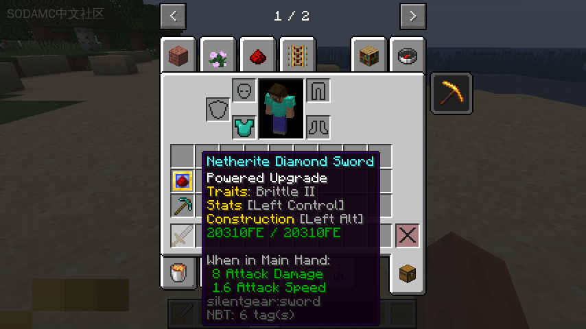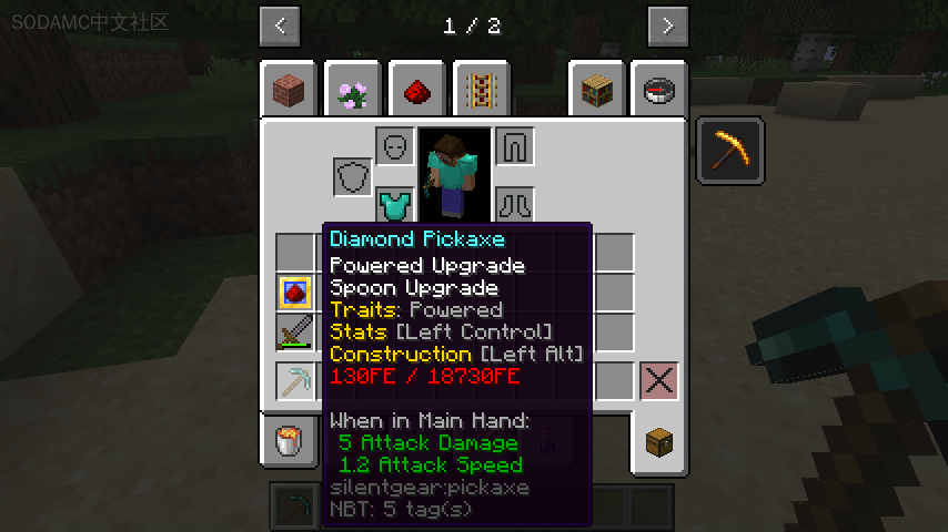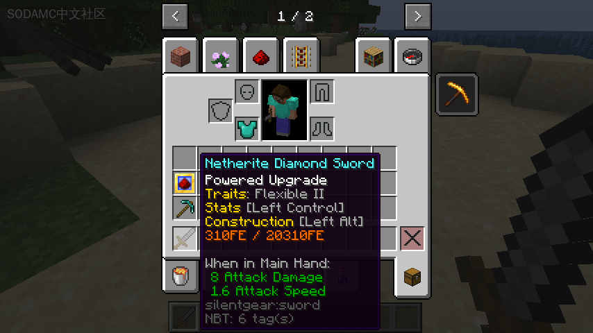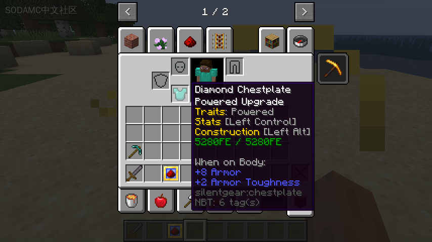 这是SilentGear的一个小型附加模组,允许使用Forge能量(FE)来修复SilentGear物品。这个模组添加了动力升级,可以从高级升级基础和一些红石合成。将任何SilentGear工具或护甲与此升级组合,将动力特性添加到物品中。这会根据物品的耐久度添加一个与之成比例的能量存储。只要能量存储中包含任何能量,物品就不会受到耐久度损坏,而是在抵消每一点耐久度时消耗一些能量。当工具耗尽能量时,它将再次失去耐久度,但只要工具再次获得足够的能量,就会立即修复。
