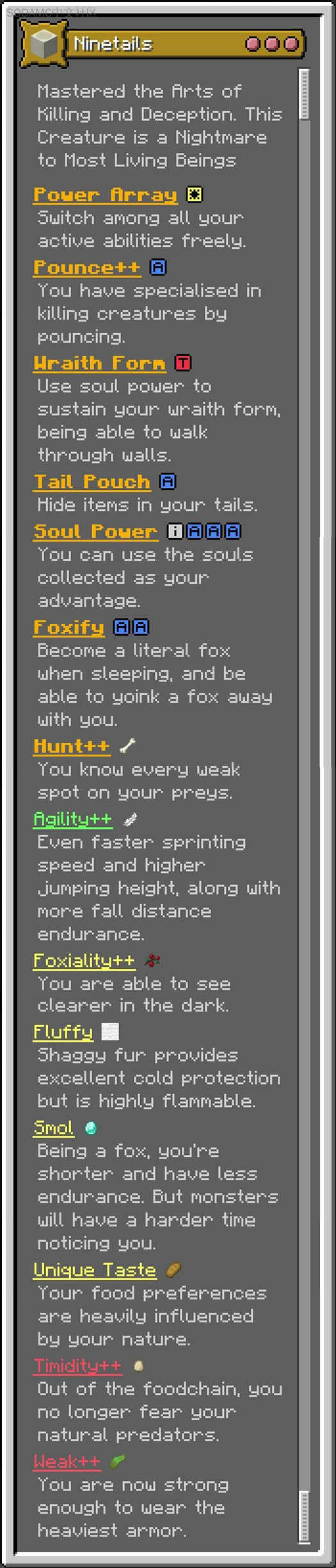 1. Soul Power: the shift + primary one will also cause 15s of Darkness + Fear effect on entities 30 blocks around