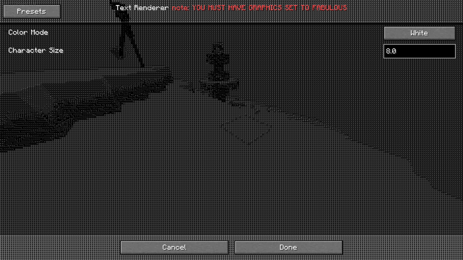 这款材质包无需任何模组支持,即可将你的Minecraft游戏完全渲染为ASCII艺术。你只需在Minecraft视频设置中将图形设置为“华丽”即可使用此材质包。