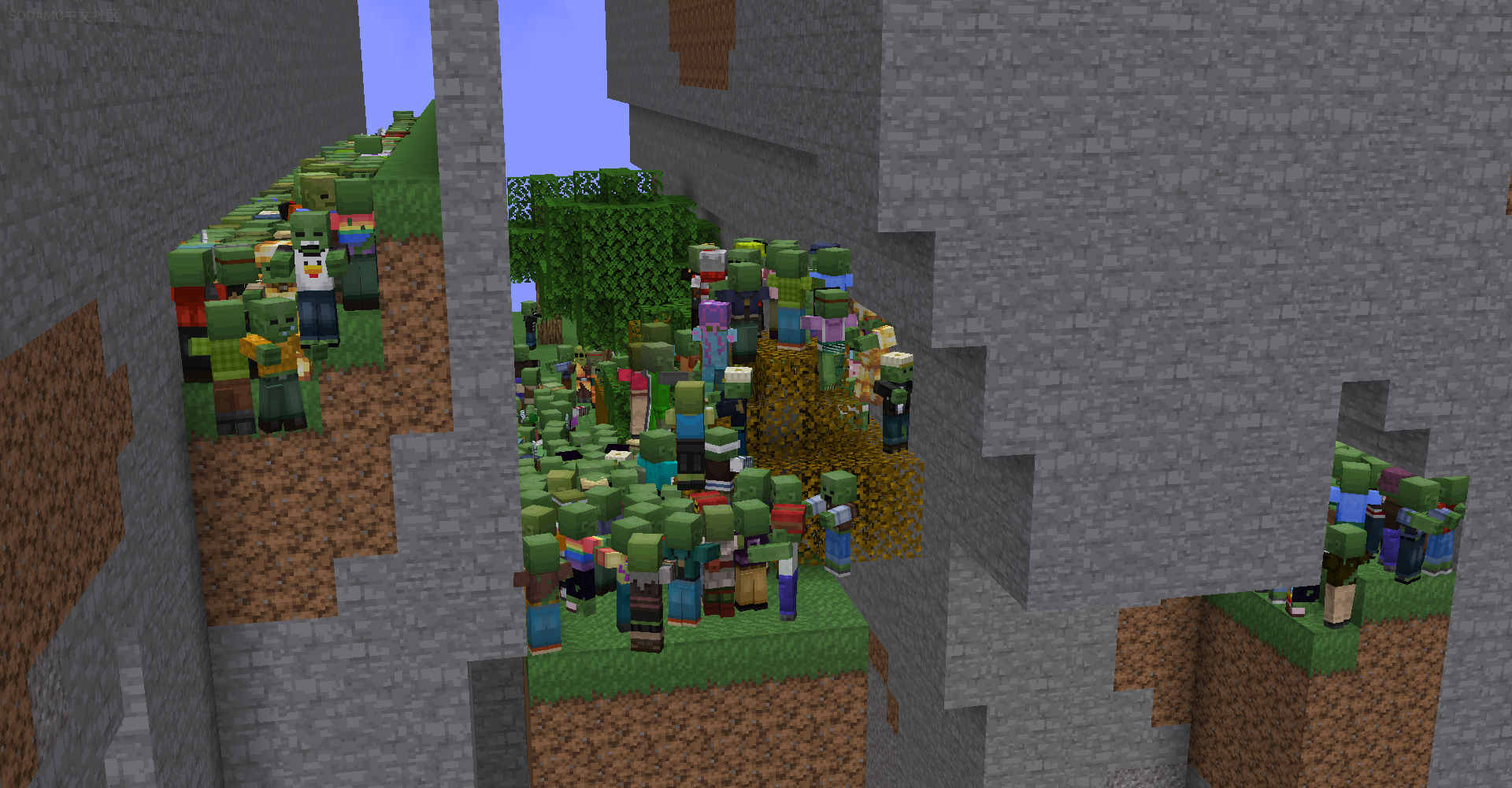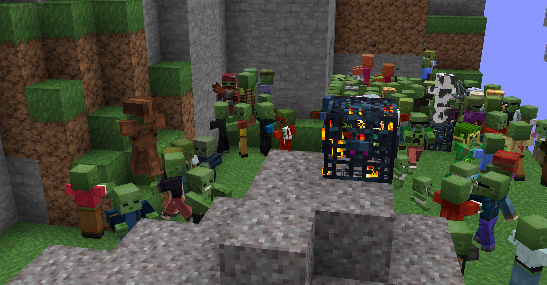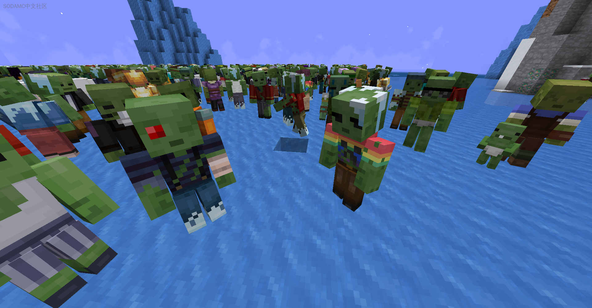 这个资源包为僵尸添加了2亿种可能的变体,并参考了整个Minecraft多元宇宙中的玩家皮肤。它通过混合随机的头部、面部表情、衬衫、牛仔裤以及两层随机的撕裂效果,实现了这种沉浸式的体验。